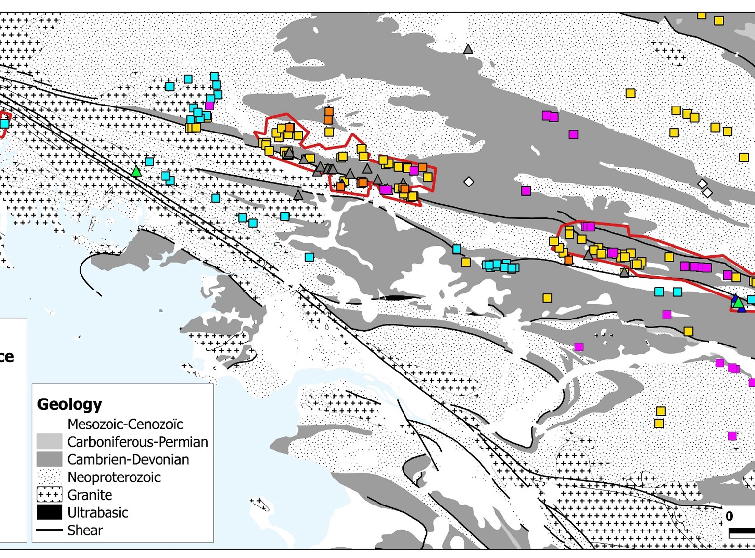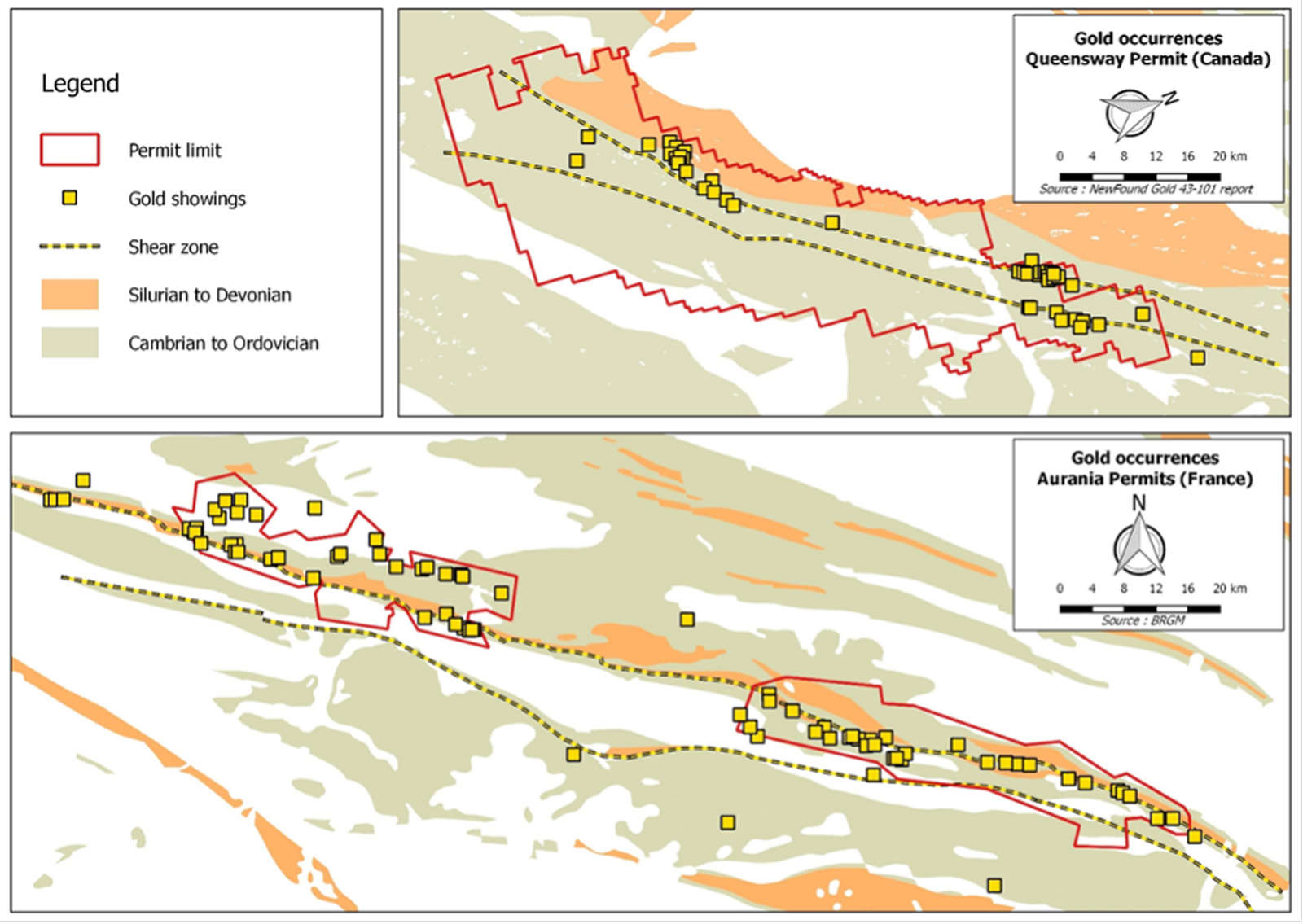 Comparing the abundance and dispersion of gold occurrences as well as the favourable tectonic and geological context, the permit area shows similarities with the Queensway project of NewFound Gold in Newfoundland.