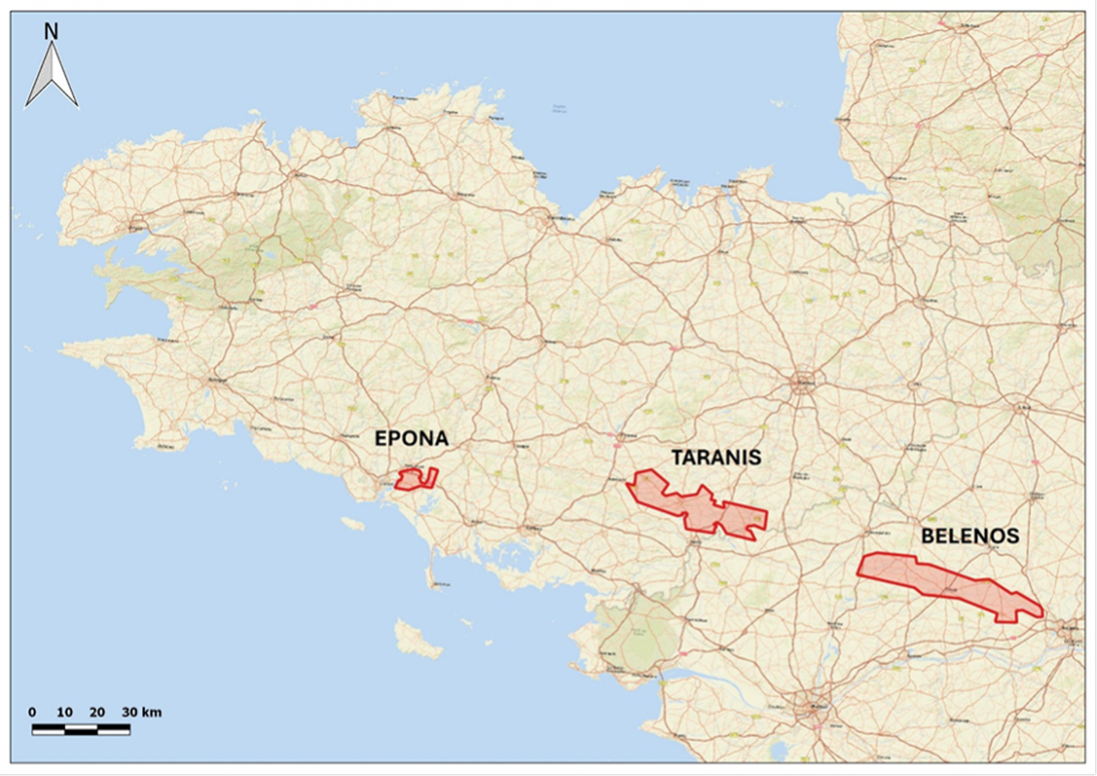 Aurania announced the filing of an exploration permit named Epona back in 2023 (see press release dated July 24, 2023). Subsequently, in October 2023, the Company submitted two additional applications, Taranis and Bélénos, covering areas of 359.5 km² and 440.9 km² respectively. These areas are located in southern Brittany and northern Pays de la Loire in France.