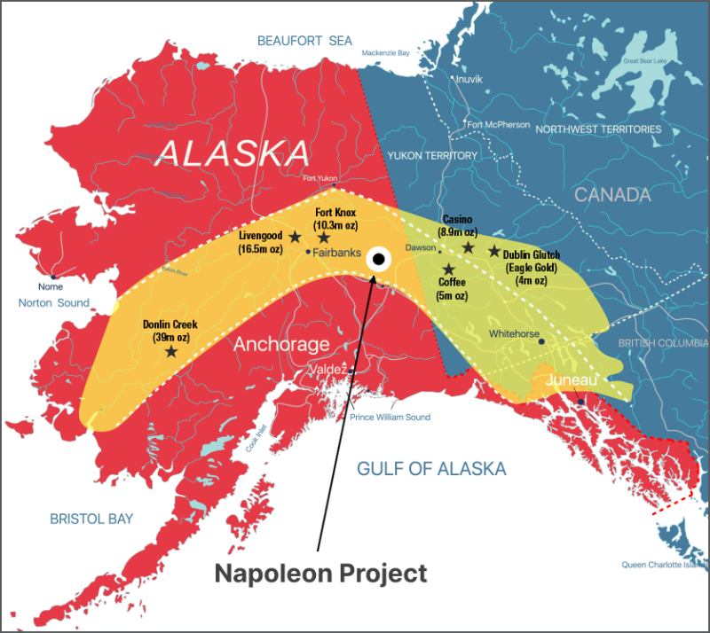 Napoleon is located in the Fortymile Region of Eastern Alaska, which has produced an estimated 500,000 oz of placer gold. Despite this extensive placer production, no major hard rock or “lode gold” production has been documented in the district.