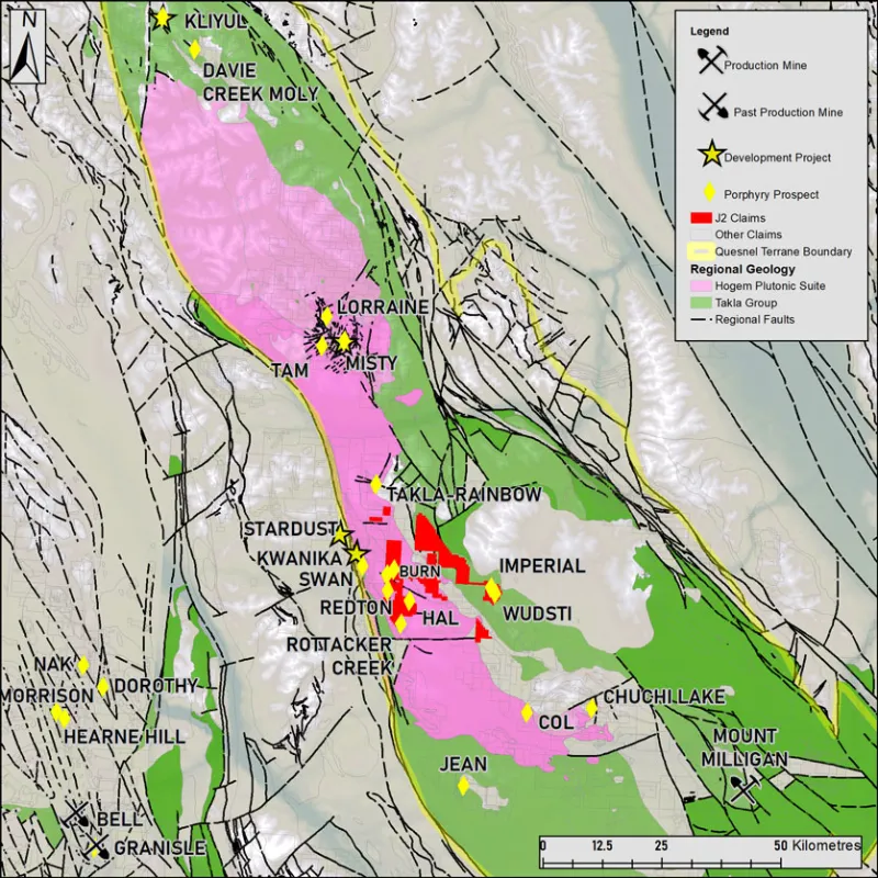 The Quesnel terrane is a Mesozoic arc complex that stretches the length of the province and contains numerous late Triassic to Early Jurassic calc-alkaline and alkaline intrusions hosting Cu-Au-Mo-Ag porphyry deposits. The region around TM is characterized by Takla Group Volcanics overlain by the Chuchi lake and Twin Creek successions. These are intruded by various phases of the Hogem Batholith. The terrane is bound by the Pinchi Fault to the West and the Manson-McLeod fault to the east with many cross structures marking a complex structural environment for porphyry emplacement.