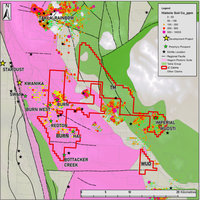 J2 conducted a large-scale reconnaissance MMI Sampling program over the property in 2022 and 2024. Anomalous copper in soil was encountered in the southern Burn block and the northern extent of the TM block. A multi-year area based permit was obtained in 2023 on the Burn block with hopes to conduct IP geophysics in the near future as well as further infill soil geochemistry sampling.